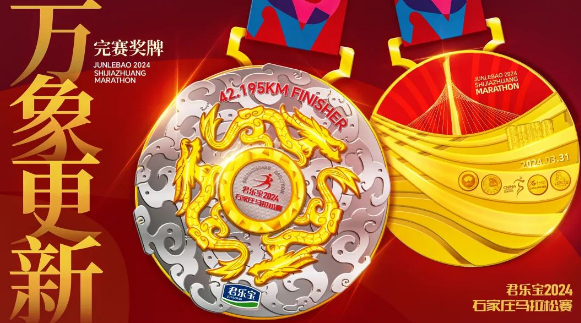 赛事奖牌名称为“万象更新”。今年是龙年,龙是中华民族的图腾。奖牌正面外雕三条金色游龙,充满生机盎然气势,加上卷云交相呼应。灵感来自出土于石家庄中山国王陵遗址,现存于河北博物院馆藏的文物透雕夔纹黄玉佩,彰显石家庄文化的深厚底蕴。奖牌背面参考复兴大街滹沱河大桥优美的流线设计,具有很强的视觉冲击力。建筑分别为复兴大街滹沱河大桥、正太广场,下方为石家庄“母亲河”滹沱河。