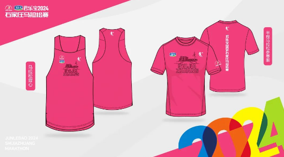 全程马拉松、半程马拉松参赛者服装颜色为“荧光飞影粉”,象征着充满青春气息、生机勃勃和轻快活泼的色彩感受,也寓意着石家庄这座城市将用满腔热情迎接八方跑者的到来。正面采用了石家庄马拉松赛事LOGO,并结合赵州桥、河北博物院、正太广场等建筑物简笔画组合而成,底部结合石家庄的拼音全称“shijiazhuang”服装的整体设计极具辨识度,也让参赛服装拥有了更高的纪念价值。