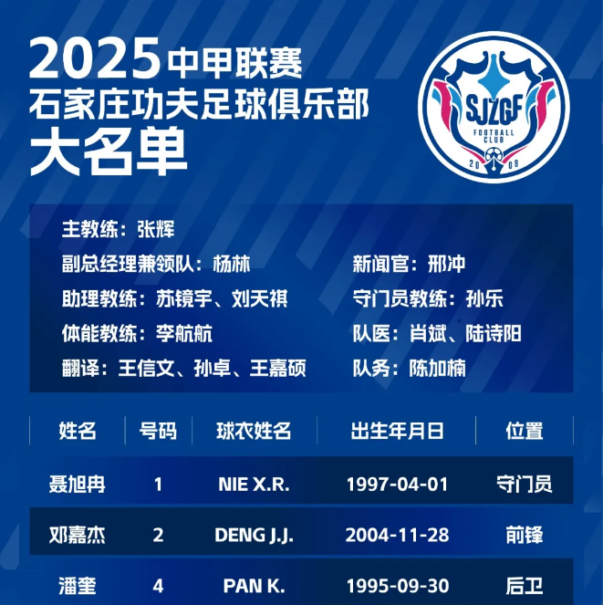 除了多位内外援的加入,石家庄功夫队在2025赛季前,也重新聘请了张辉担任主教练。张辉在2020年到2022年,曾带领石家庄功夫队实现了从中冠联赛到中甲联赛的三连跳,但在2023赛季因成绩不佳离任。