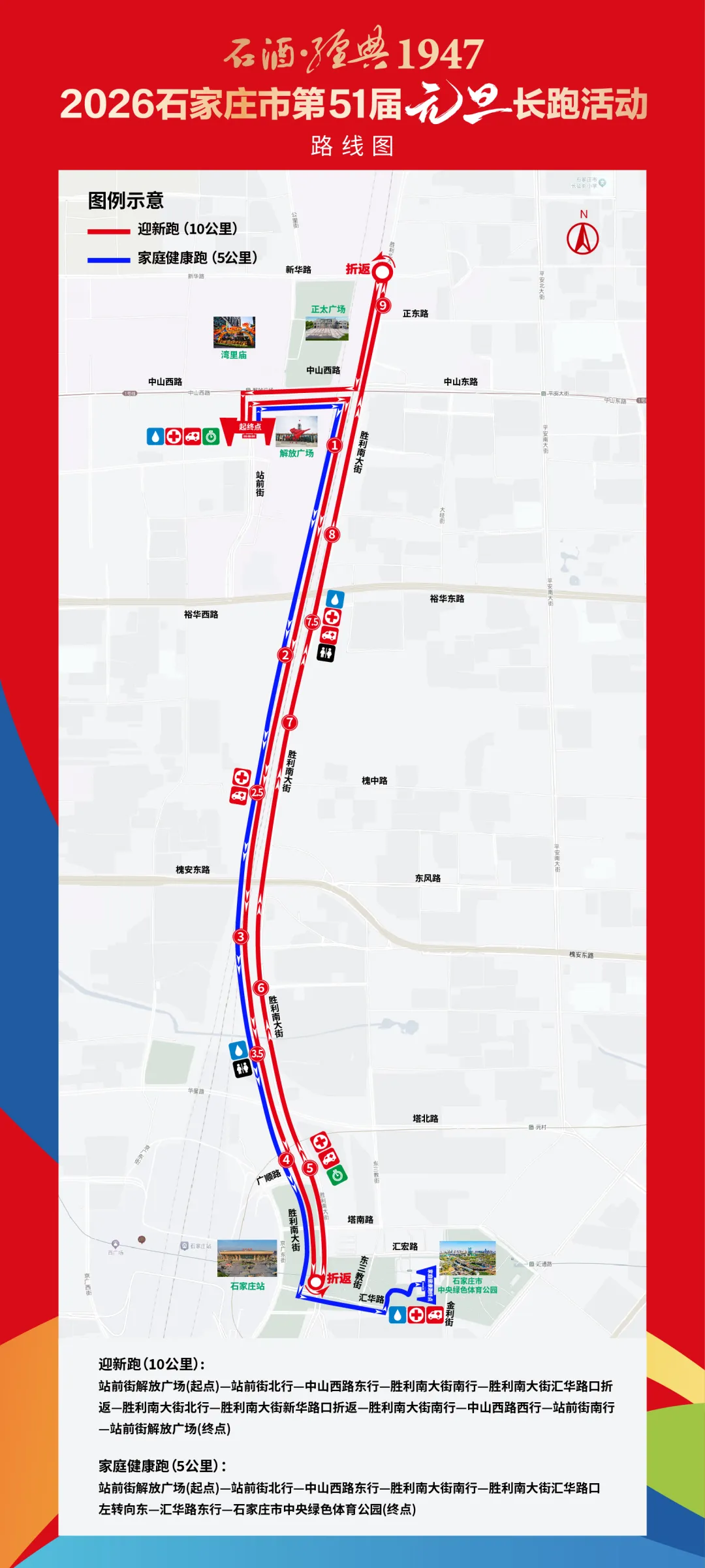 2026石家庄市第51届元旦长跑活动,将于2026年1月1日(星期四)07:30在站前街解放广场举行。为保障活动顺利进行,确保交通安全畅通,根据《中华人民共和国道路交通安全法》第三十九条规定,石家庄市公安局交通管理局决定在活动期间对相关道路实施分时、分段临时交通管制。现将活动全程交通管理措施予以通告如下:一、活动具体路线(一)迎新跑(10公里)路线站前街解放广场(起点)-站前街北行-中山西路东行-胜利南大街南行-胜利南大街汇华路口折返-胜利南大街北行-胜利南大街新华路口折返-胜利南大街南行-中山西路西行-站前街南行-站前街解放广场(终点)(二)家庭健康跑(5公里)路线站前街解放广场(起点)-站前街北行-中山西路东行-胜利南大街南行-胜利南大街汇华路口左转向东-汇华路东行-中央绿色体育公园(终点)。二、活动期间交通管制时间(一)2025年12月31日12:00至2026年1月1日14:00,站前街(自强路至中山西路段)实施临时交通管制措施。(二)2025年12月31日21:00至2026年1月1日12:00,站前街(自强路至裕华西路段)实施临时交通管制措施。途经车辆可绕行南小街、中华大街,活动结束后可恢复通行。(三)2025年12月31日19:00至2026年1月1日12:00,站前街东侧辅道(自强路至中山路段),道岔街两侧禁止停放车辆。三、活动当天交通管制事项(一)2026年1月1日07:00至9:30,期间将对中山西路(站前街至胜利大街段)、胜利大街(新华路至汇华路段)、汇华路(胜利大街至金利街段)部分道路采取分时、分段临时交通限制措施。活动沿线及周边道路的车辆驾驶人和行人,应服从公安民警指挥。(二)机动车可选择和平路、新华路、槐安路与胜利大街高架、槐安路与胜利南大街地道桥、裕华路与胜利南大街地道桥、南二环东西通行。(三)非机动车与行人可选择和平路、新华路、槐安路与胜利南大街地道桥、裕华路与胜利南大街地道桥、南二环东西通行。(四)活动举办期间,因特殊情况执行紧急任务的保障车辆、特种车辆确需紧急横穿赛道,请联系现场执勤民警。(五)临时交通管控道路恢复通行时间,由公安机关交通管理部门根据活动情况决定,请各界群众给予理解支持。(六)活动当天,交管部门将通过省、市电台广播、石家庄交警微博密集播报实时路况,敬请市民在出行前掌握全市交通动态,合理选择出行线路。