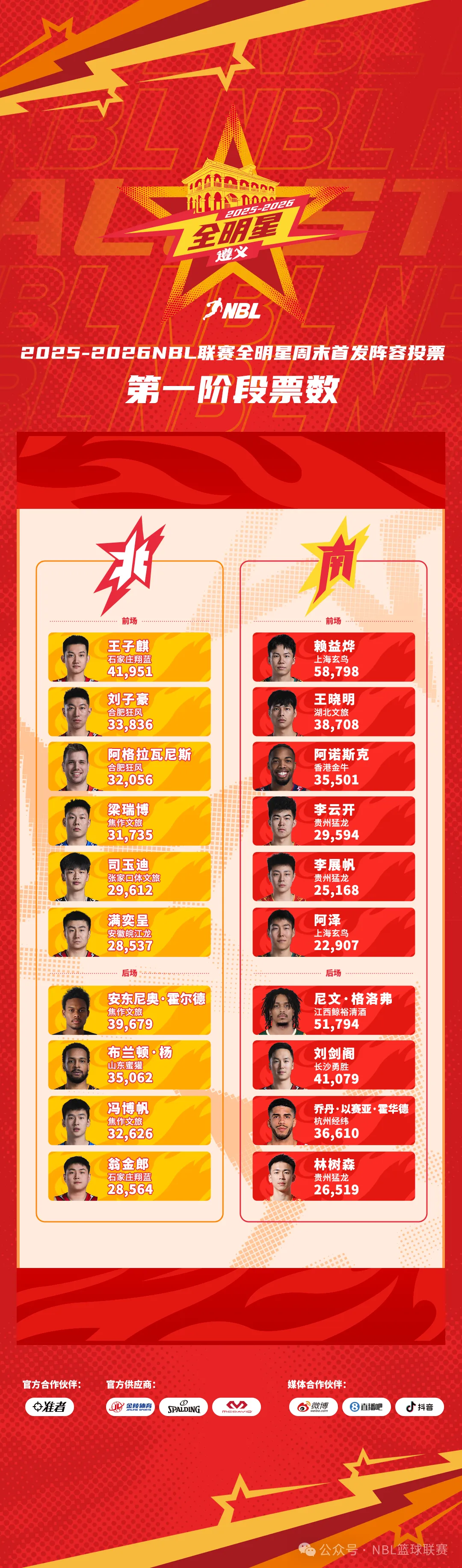 NBL联赛全明星周末首发阵容投票第一阶段计票结果昨天出炉,截至1月15日晚北区暂时领先的是来自石家庄翔蓝的王子麒,他目前获得41951票。上海队球员赖益烨以58798票暂居南区第一。