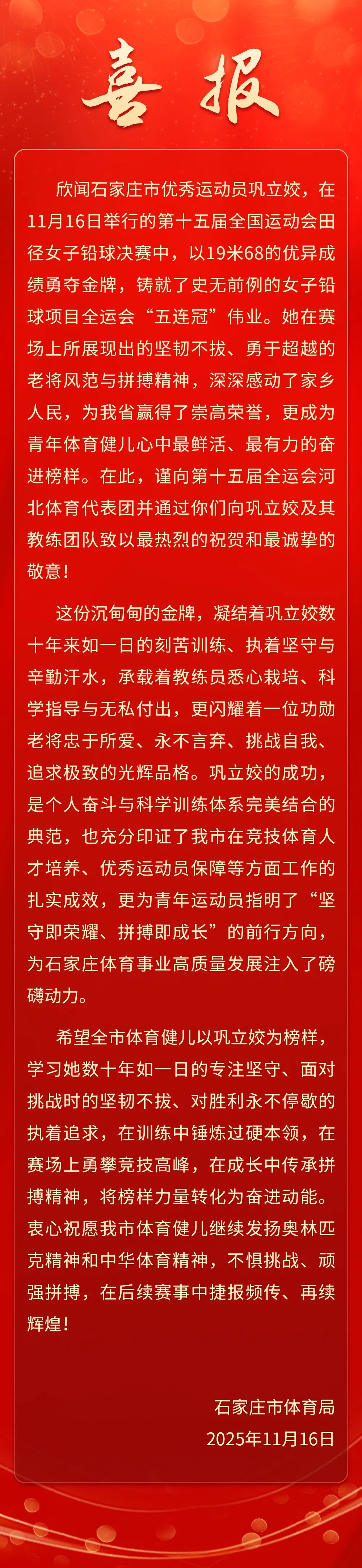 喜报 | 石家庄运动员巩立姣勇夺十五运女子铅球金牌,实现史无前例“五连冠”!