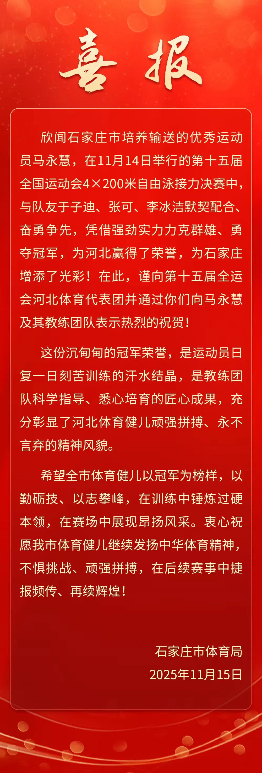 喜报 | 石家庄运动员马永慧斩获第十五届全运会4×200米自由泳接力金牌