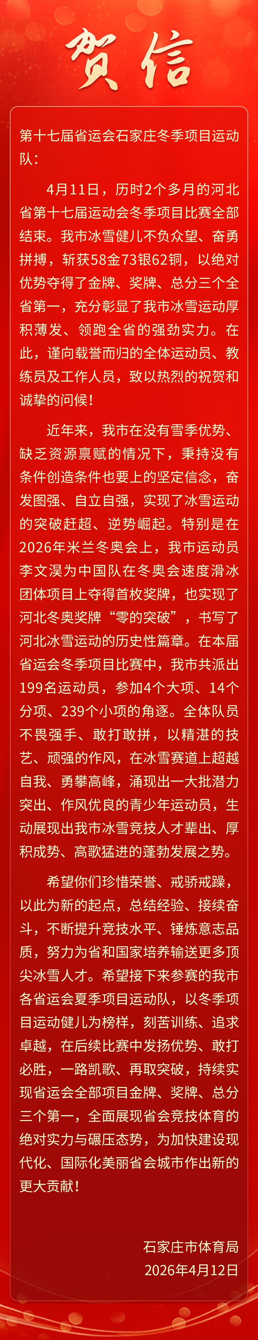 金牌、奖牌、总分三个全省第一!石家庄市体育局致贺信