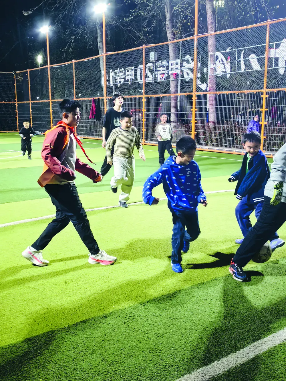 当夜幕降临,希望绿洲公园的足球场上迎来了一群少年,他们分成两队,你攻我守,拼得热火朝天。带球,过人,抢断,射门……“球进了!”场边一阵叫好。孩子们追着球全场跑动,欢笑声不断。“吃完饭就和朋友们约着来踢球,既过瘾又健身!”李宇宁笑着说。