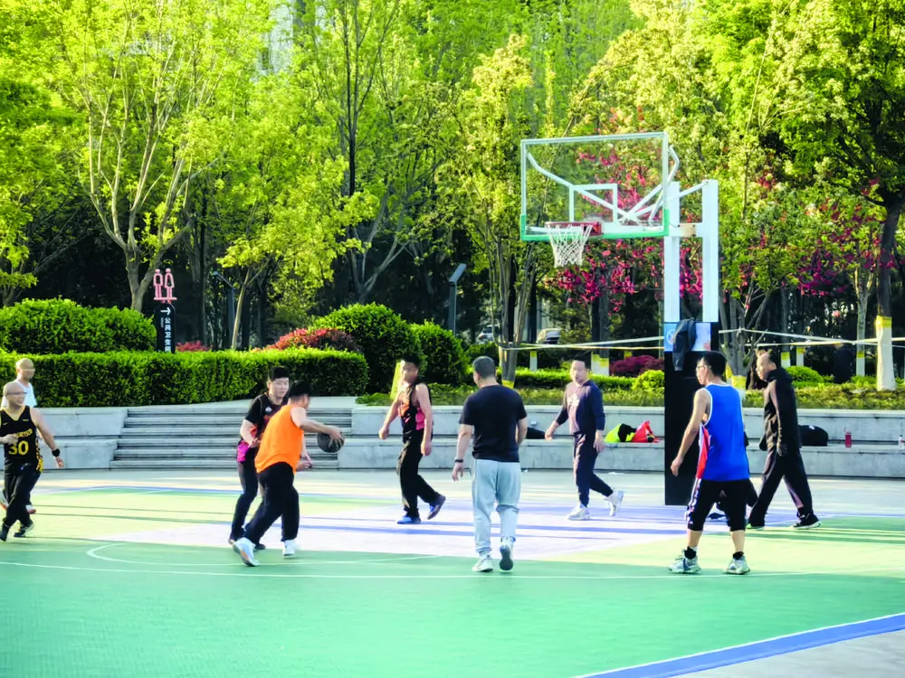在裕东公园的篮球场上,一场比赛正打得难解难分。双方都铆足了劲儿,攻防转换快得像闪电。这边刚抢下篮板,那边已经扑到篮下。只见一个高个子接到传球,不慌不忙,运球两步,在3分线外跳起,球在空中旋转着飞向篮筐,“砰”的一声打板入网!队友冲过来击掌,表示祝贺。“这篮球场都是专业的篮球场,自从这个公园2022年建成后,我们几乎每周都要来打一两次球,既锻炼了身体,也让平淡的生活多了几分激情!”张先生如是说。
