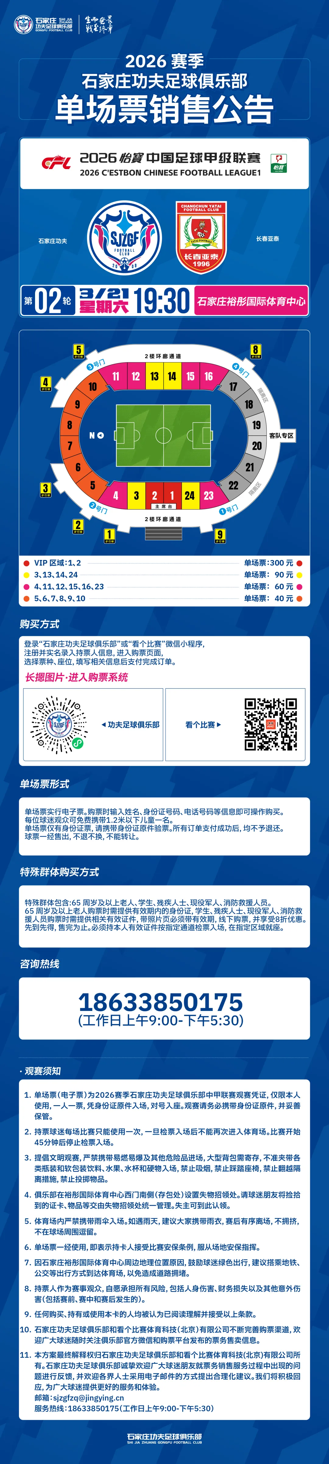 3月21日本周六19:30,石家庄功夫将在主场裕彤国际体育中心,迎接长春亚泰的挑战,这也将是2026赛季的首个主场。本场比赛单场票现已开售,让我们一起齐聚裕彤,为石家庄功夫加油!